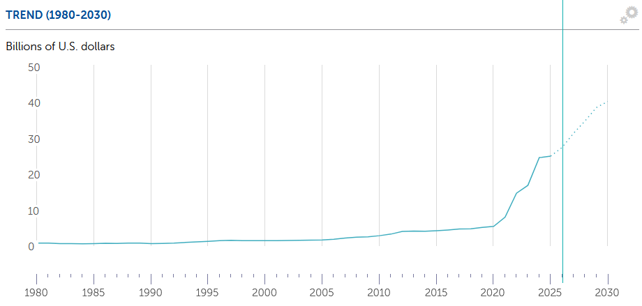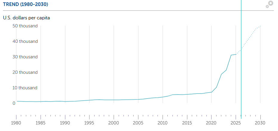 Le Guyana est un pays pétrolier récent. C’est en 2015 qu’ExxonMobil a découvert des gisements de pétrole dans ce petit pays de 800,000 habitants frontalier du Venezuela. Ses réserves gigantesques font que le pays pourrait devenir le 4ème producteur mondial de pétrole offshore d’ici à 2035. Depuis cette découverte, le PIB a explosé comme on peut le voir sur les graphes qui suivent.