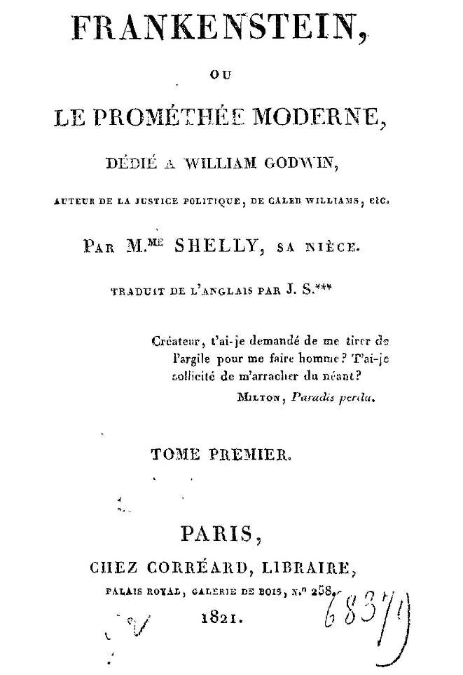Dans le roman de Mary Shelley publié en 1821, Victor Frankenstein est le savant suisse créateur du Monstre. Comme le dit le sous titre, Frankenstein est le Prométhée moderne.