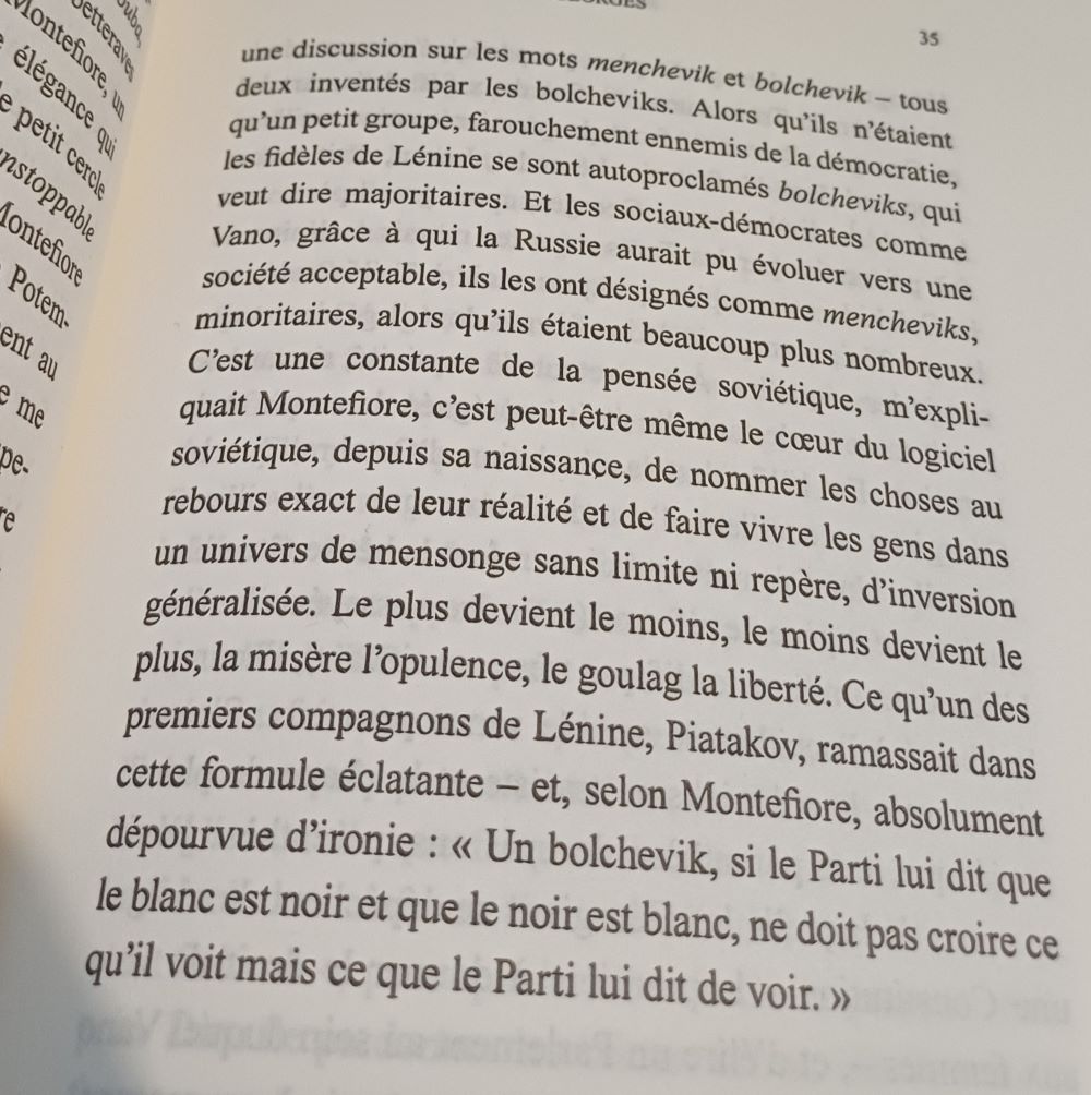 Bolchevik signifie majoritaire. Dès 1903, alors qu’ils n’étaient qu’un tout petit groupe, les fidèles de Lénine se sont nommés bolchéviques et ont appelé leurs adversaires menchevik, minoritaires. Déjà une distorsion de la réalité en mal nommant les choses pour paraphraser Camus.