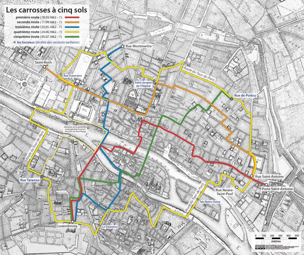Le premier système de transport en commun a été inventé par Blaise Pascal en 1661, à la veille de sa mort. Il a fondé les carrosses à cinq sols, des transports urbains dans Paris : prix fixe (5 sols), itinéraire fixe, horaires réguliers. Cette entreprise poursuivait un double objectif : faciliter la vie des petites gens et utiliser les bénéfices pour aider les pauvres.